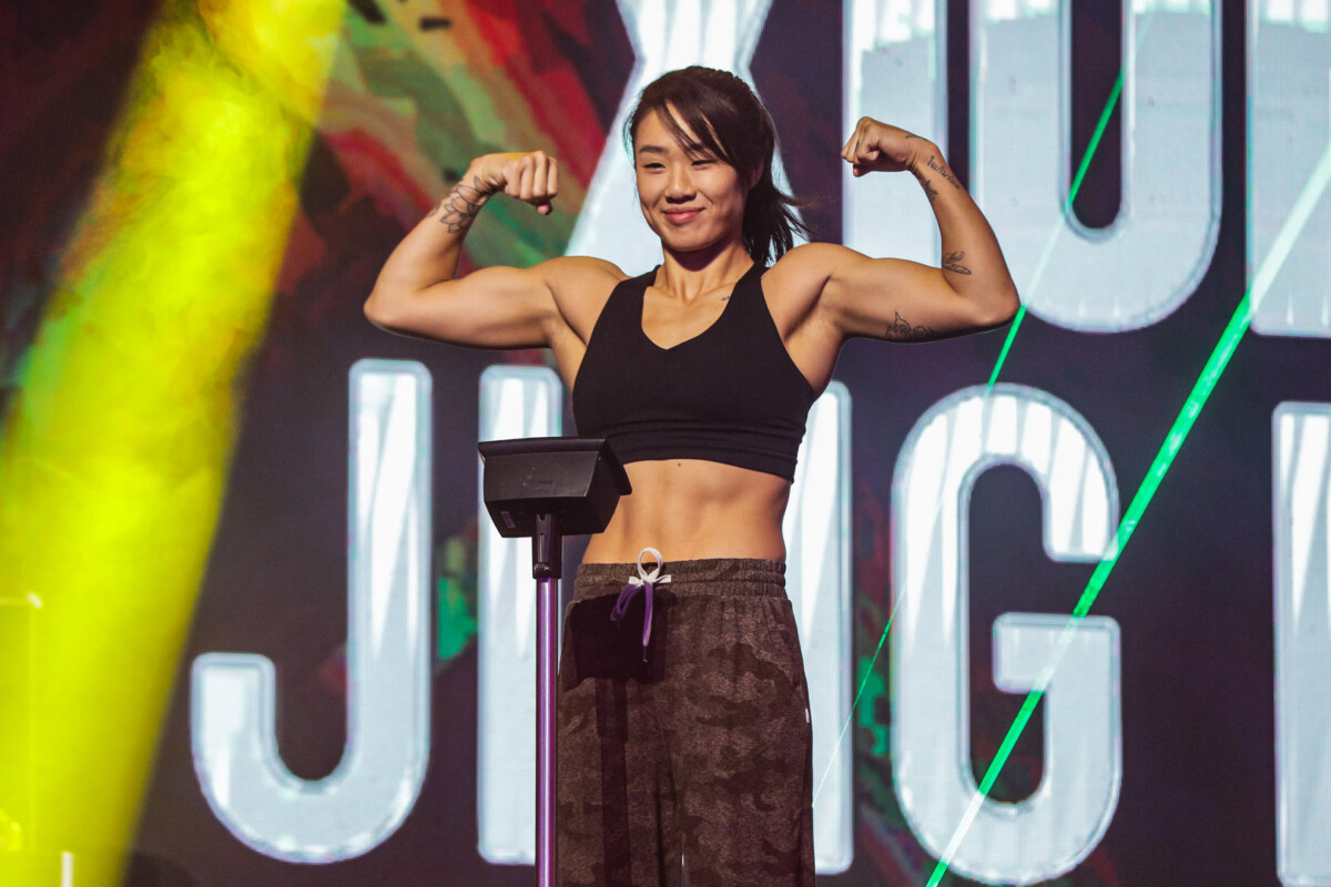 Angela Lee shows her muscles during the ONE Fight Night 2 official face-off and ceremonial weigh-in in Singapore on Friday.