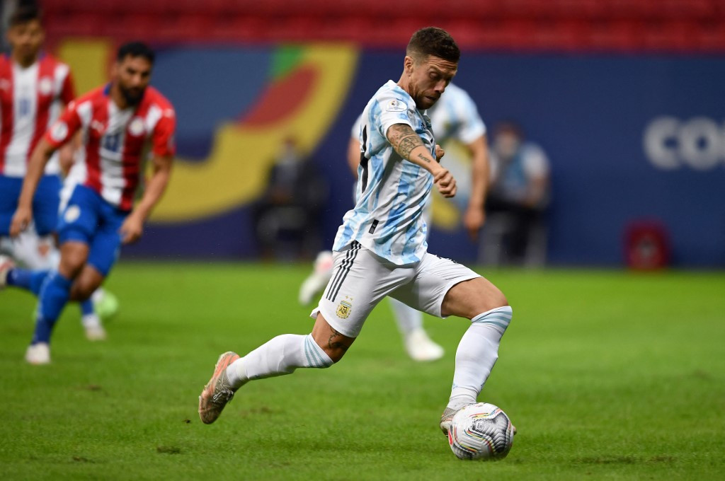 Argentina's Alejandro Gomez controls the ball during the Conmebol Copa America 2021 football tournament group phase match between Argentina and Paragu